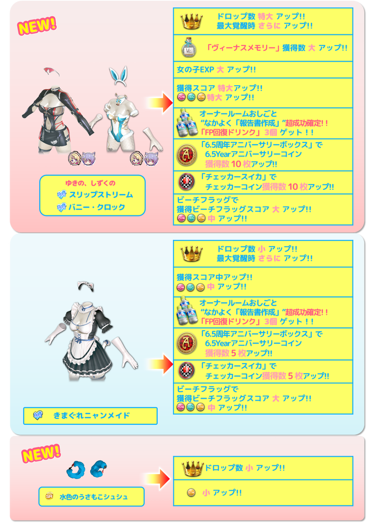・期間限定のイベント、水着、アクセサリ、アイテムは再登場する可能性がございますので、