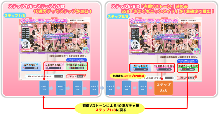 ※「ステップ8/8」の有償限定10連ガチャを引いた後、「ステップ1/8」の状態に戻ります。