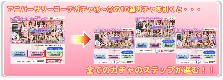 いずれかの「アニバーサリーコーデガチャ」で10連ガチャを引くと、それ以外の「アニバーサリーコーデガチャ」のステップ数も増加いたします!
