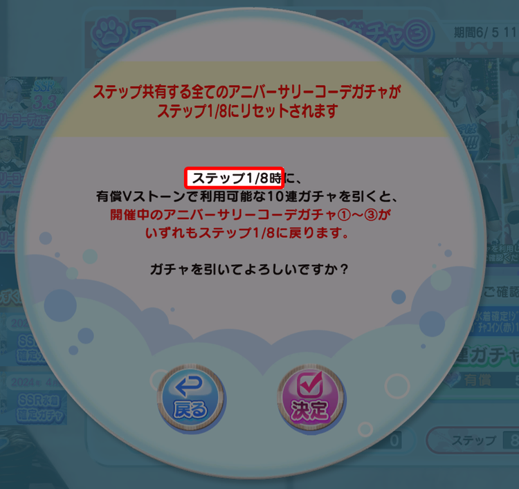 ステップを共有する全てのガチャが「ステップ1/8」に戻ります。